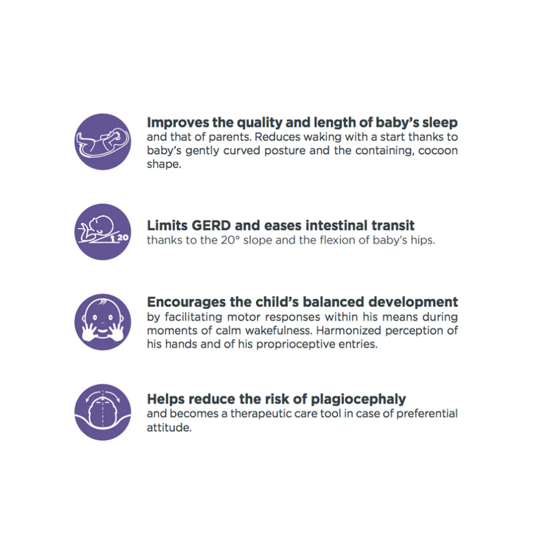 - Improves the quality and length of baby’s sleep and that of parents. Reduces waking with a start thanks to baby’s gently curved posture and the containing, cocoon shape.